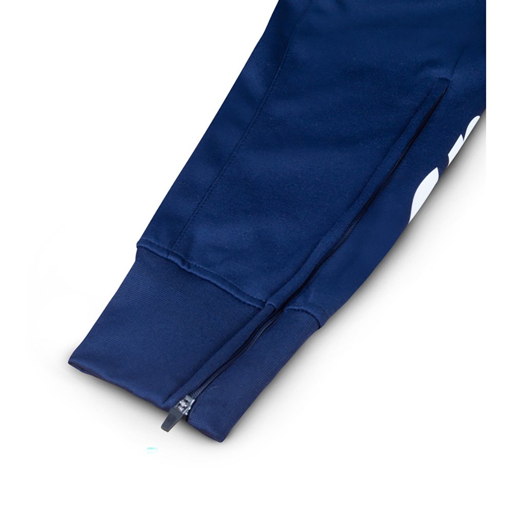 Pantalonii de trening sunt prevazuti cu buzunare cu fermoar, banda elastica cu fermoar la baza piciorului.