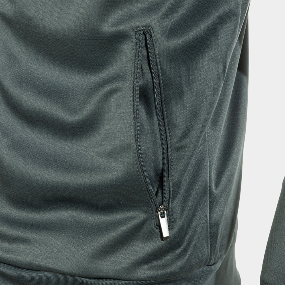 Bluza de trening fără glugă este prevăzută cu fermoar frontal complet, pentru o ajustare rapidă și practică. Manșetele și tivul inferior ribbed asigură o fixare confortabilă și stabilă, în timp ce buzunarele laterale cu fermoar permit depozitarea în siguranță a obiectelor personale.